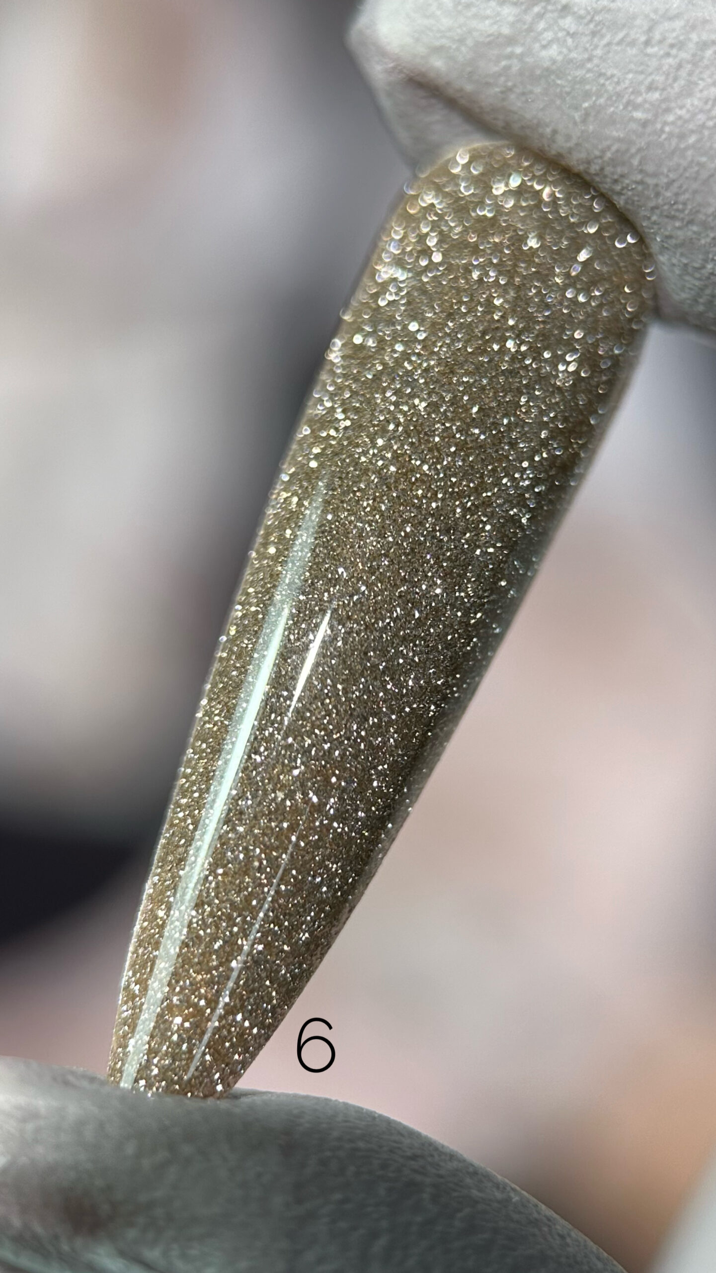 - При денному світлі або у звичайному приміщенні лак виглядає як щільне золотисте покриття з мікрошиммером.