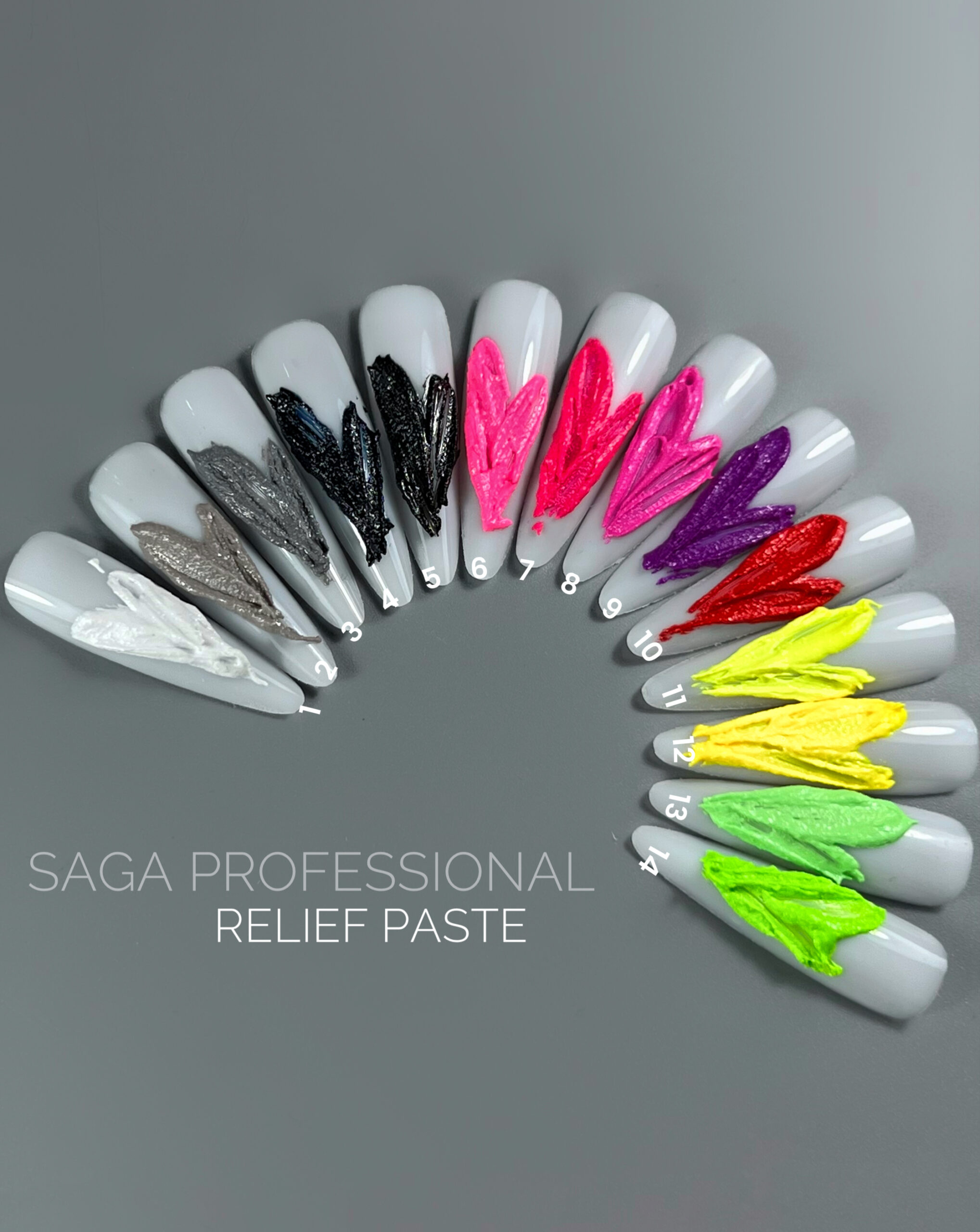 SAGA Professional Relief Past — це колекція рельєфних гель-паст (або “пластилін-гелів”) у невеликих баночках, призначена виключно для художнього оформлення нігтів та створення об’ємних, 3D-елементів.